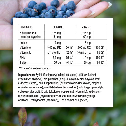 Argus indeholder anthocyaniner fra blåbærekstrakt, lutein fra stor fløjlsblomst, A- & E-vitamin og zink.