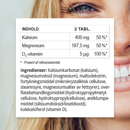 Skelet og tænderCalcium, magnesium og D-vitamin bidrager til at opretholde normal knoglestruktur og normale tænder.