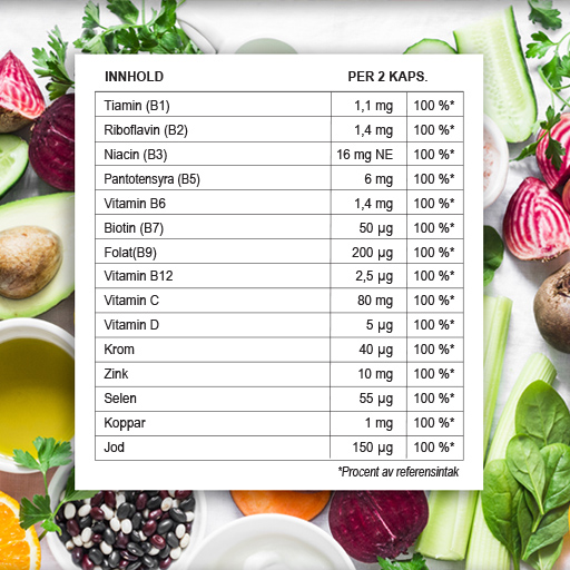 B- & C-Vitamin til bidrager at reduceretræthed og udmattelse. B-Vitamin bidrager til normal energiomsætning.